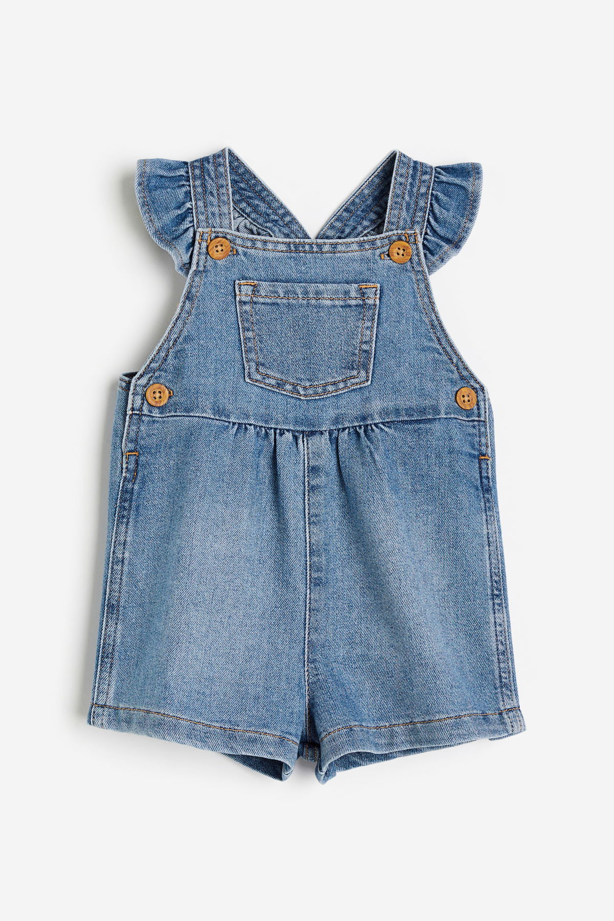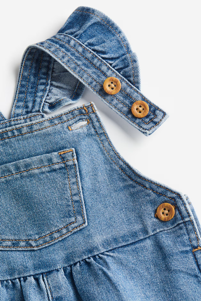 Este jardinero corto, con su denim suavecito y volados en los tirantes, fue pensado para esas aventuras chiquitas que quedan guardadas para siempre.