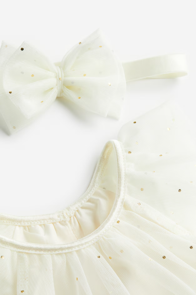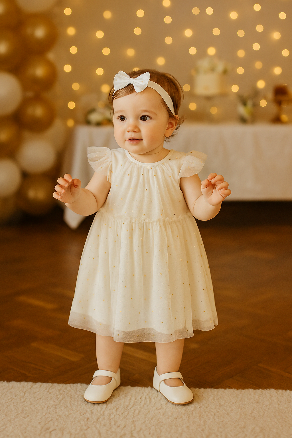 Este vestidito de tul suave y puntos dorados tiene esa magia de las noches de cuento, de los sueños livianos y los primeros bailes en brazos.