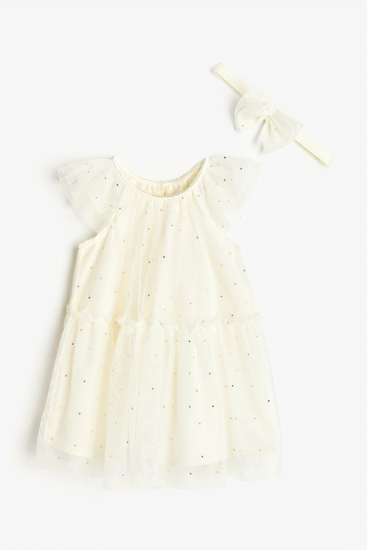 • Vestido color crema con doble capa de tul y mini lunares dorados